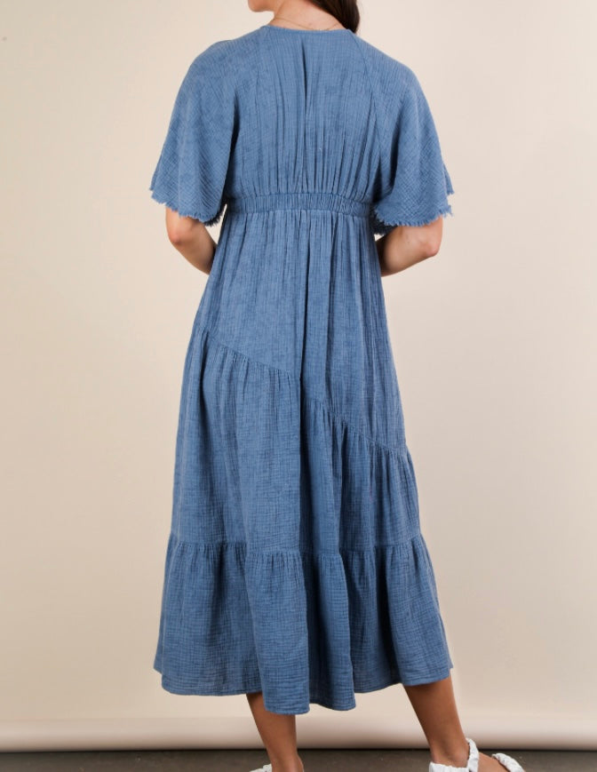 Mineral washed elastic neck dress short sleeve v neck raw edge detail
