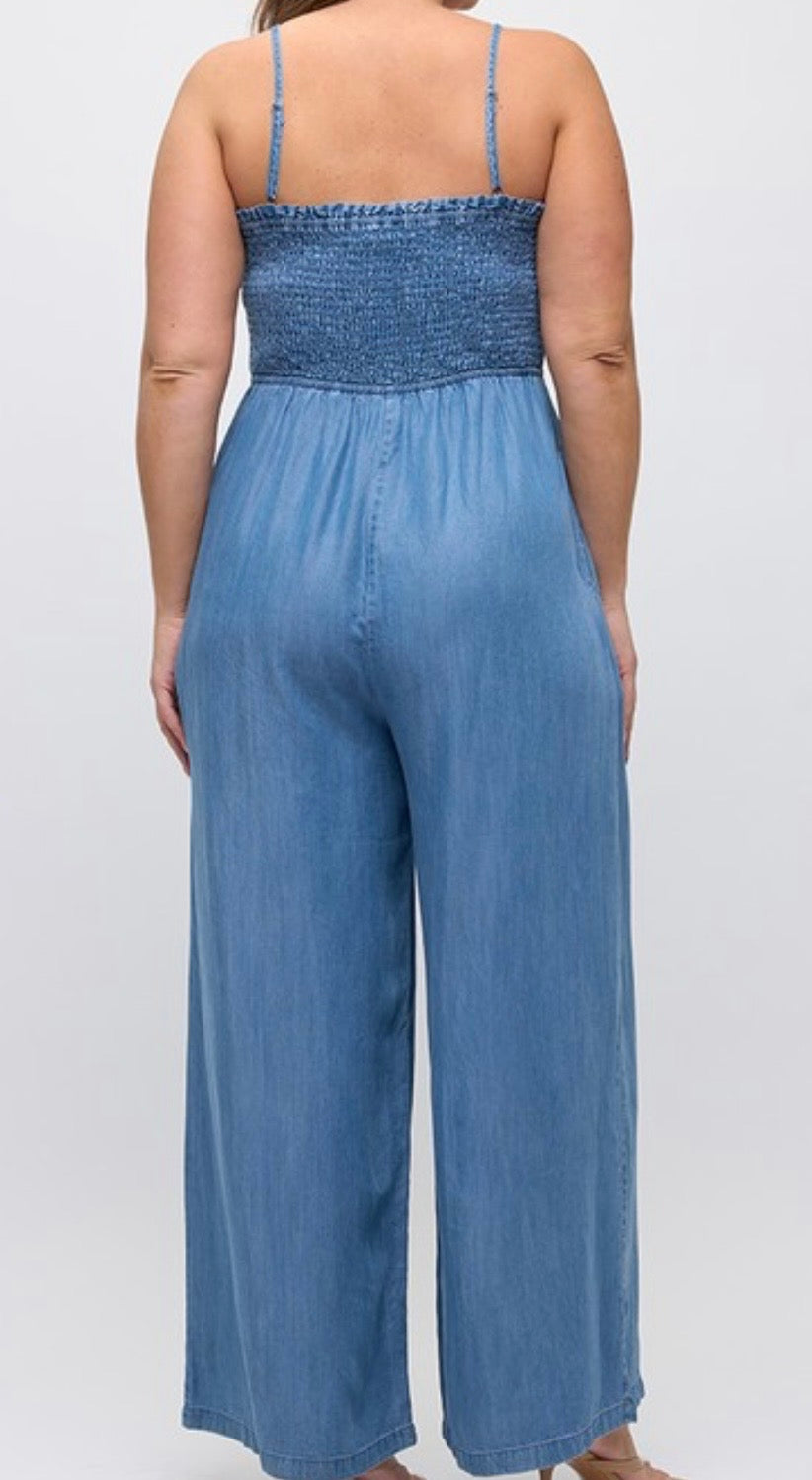 Chambray smocked jumpsuit with pockets