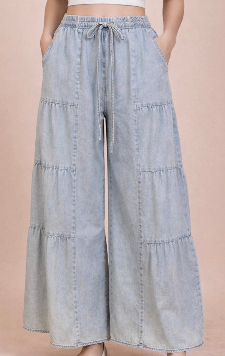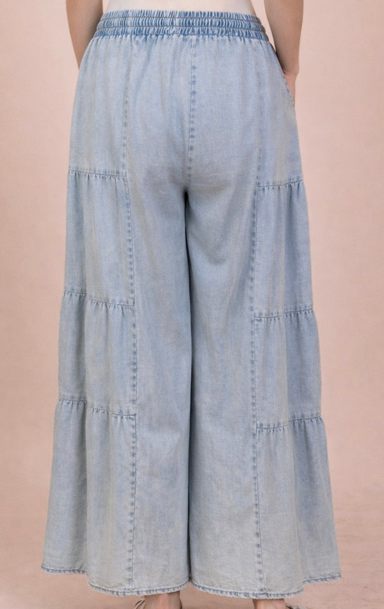 tiered Mineral washed chambray wide leg pant with tie detail and pockets with elastic waist